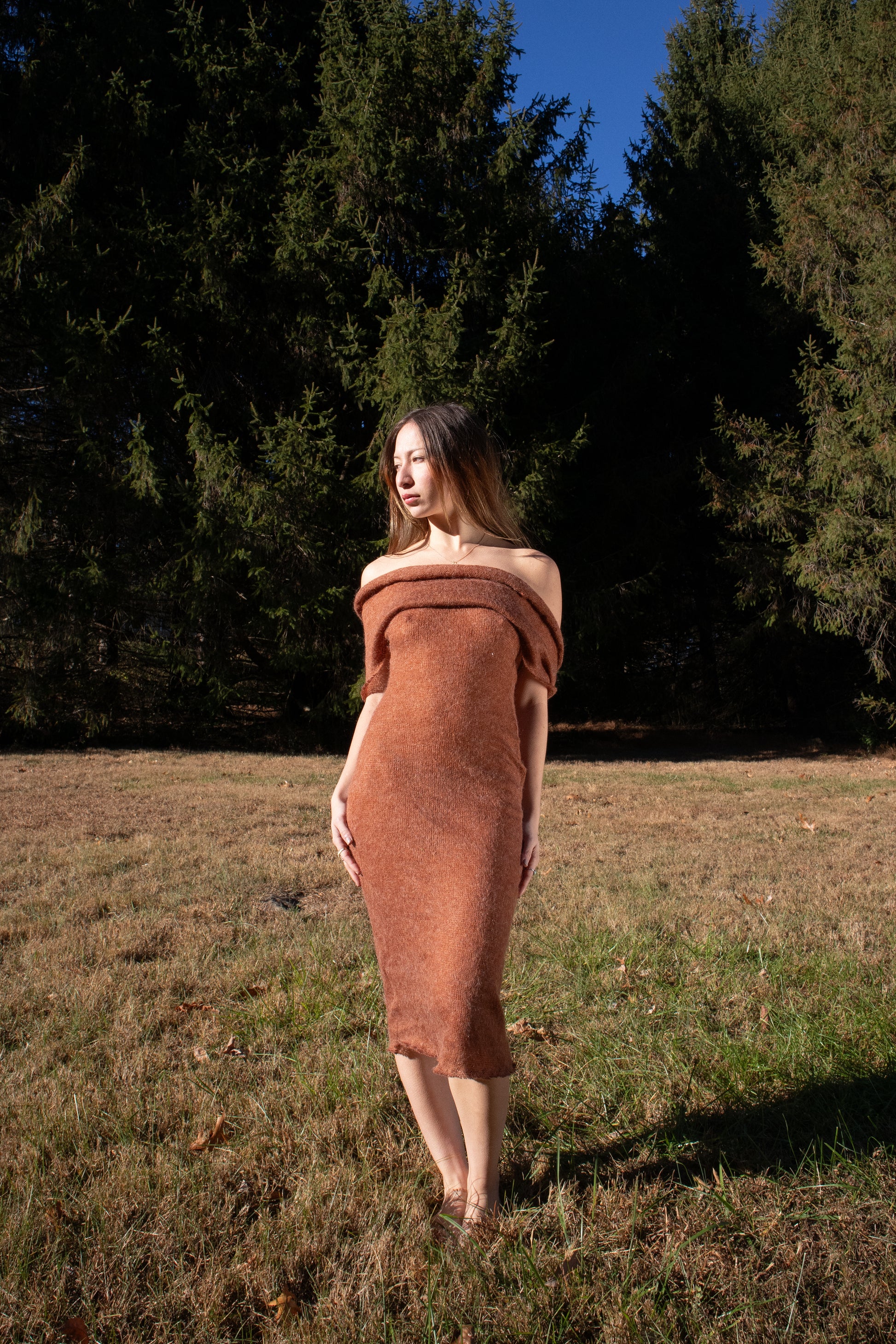 A strapless midi length dress, composed of imported Italian wool. The Cinnamon dress features an attached shall to give a double layer at the bust. You have many options to play around with wearing the shall, as pictured. An elastic band sewn at the bust, ensures no slipping and a comfortable fit throughout your wear.